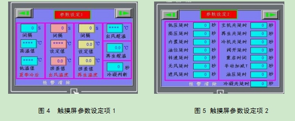 參數(shù)設(shè)定包括:觸摸屏參數(shù)設(shè)定及電氣元件參數(shù)設(shè)定。觸摸屏參數(shù)設(shè)定項(xiàng)如圖 4、圖 5 所示。電氣元件參數(shù)設(shè)定項(xiàng)主要包括壓縮機(jī)排氣超溫報(bào)警值,噴液溫度值,主加熱超溫值、再生加熱超溫值,壓縮機(jī)吸氣低壓報(bào)警值,壓縮機(jī)排氣高壓報(bào)警值,主風(fēng)道無(wú)風(fēng)報(bào)警值, 主風(fēng)道超壓報(bào)警,冷凝風(fēng)機(jī)過載,主風(fēng)機(jī)過載,壓縮機(jī)過載等