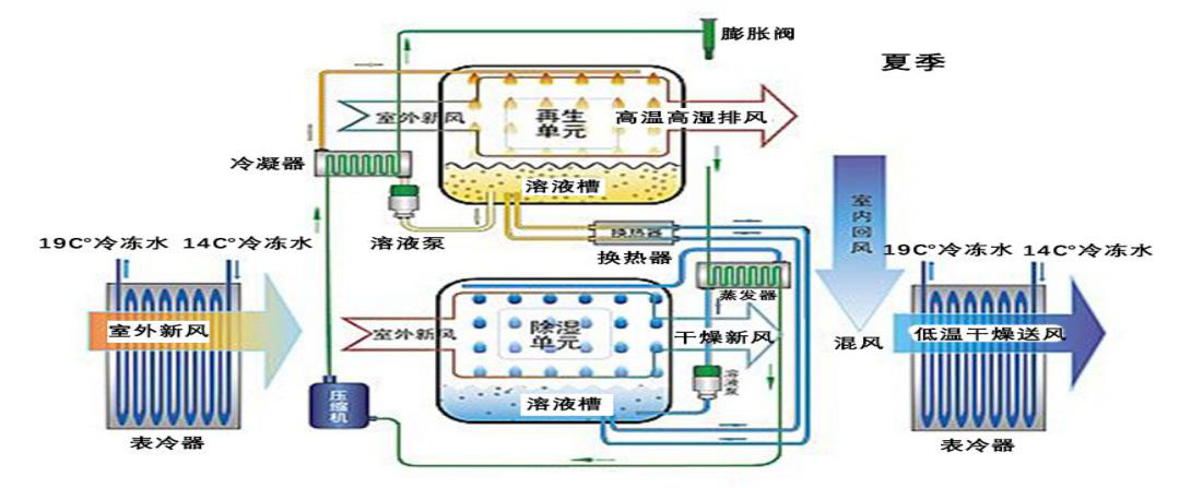 溶液除濕空調(diào)系統(tǒng)是基于以除濕溶液為吸濕劑調(diào)節(jié)空氣濕度,以水為制冷劑調(diào)節(jié)空氣溫度的主動(dòng)除濕空氣處理技術(shù)而開(kāi)發(fā)的可以提供全新風(fēng)運(yùn)行工況的新型空調(diào)產(chǎn)品;其核心是利用除濕劑物理特性,通過(guò)創(chuàng)新的溶液除濕與再生的方法,實(shí)現(xiàn)在露點(diǎn)溫度之上高效除濕。系統(tǒng)溫濕度調(diào)節(jié)完全在常壓開(kāi)式氣氛中進(jìn)行。具有制造簡(jiǎn)單,運(yùn)轉(zhuǎn)可靠,節(jié)能高效等技術(shù)特點(diǎn)。