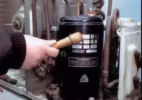 一般選擇木錘或者就地選擇可用物件。在壓機(jī)啟動(dòng)時(shí)重錘敲擊其身上的三個(gè)焊點(diǎn)。但要注意力道,不能敲變形。輕輕地敲擊壓縮機(jī)外殼,把卡住部位稍微振松,有時(shí)可啟動(dòng)運(yùn)轉(zhuǎn)或把電源電壓往上調(diào)高10%,多次啟動(dòng)沖擊,這個(gè)方法可解決潤(rùn)滑不夠的卡缸現(xiàn)象,對(duì)旋轉(zhuǎn)式壓縮機(jī)特別有效。